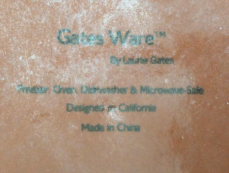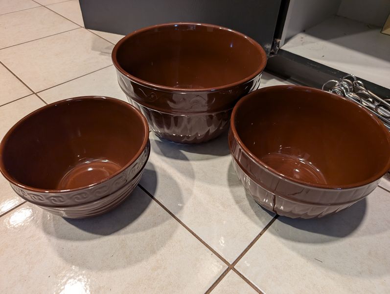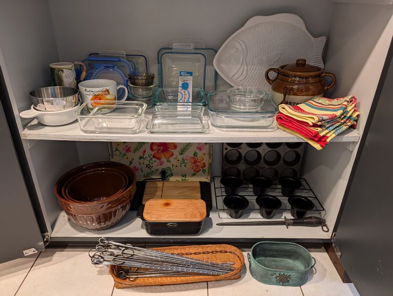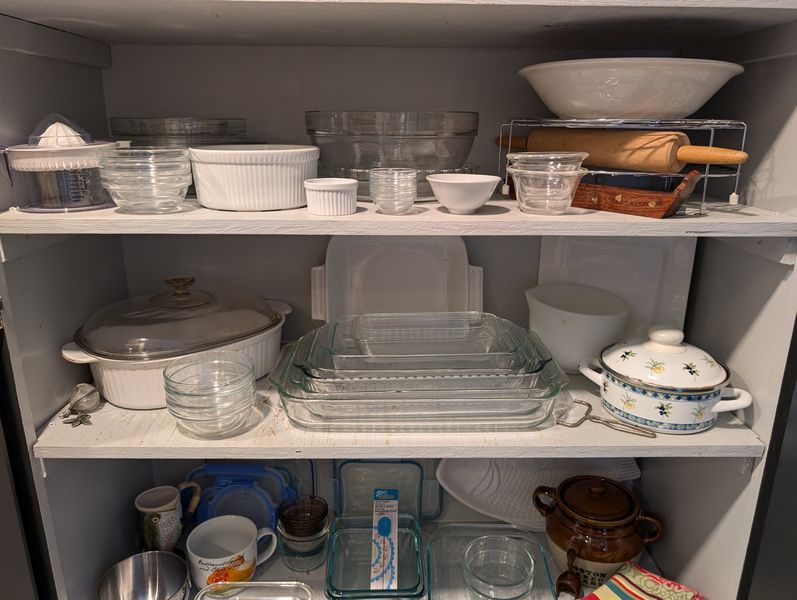 Bakeware, featuring Pyrex and Corning. Covered Corning oval baker, 4L; glass baking dishes, largest, 15"Lx10"W; Cuisinart white baking dish, 9"sq; Sunbeam white mixing bowl, US made; Pyrex glass baker, 8"sq; glass butter dish; brown 3-piece Gatesware bowl set by Laura Gates, largest 11"diameter; cutting boards; muffin tins; bean pot; Royal Doulton covered pit with floral pattern, 7"diameter (matches larger item in lot #23); white Portuguese fish platter, 16"L; other related items as seen in photos.