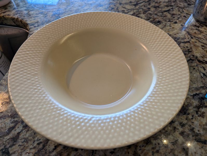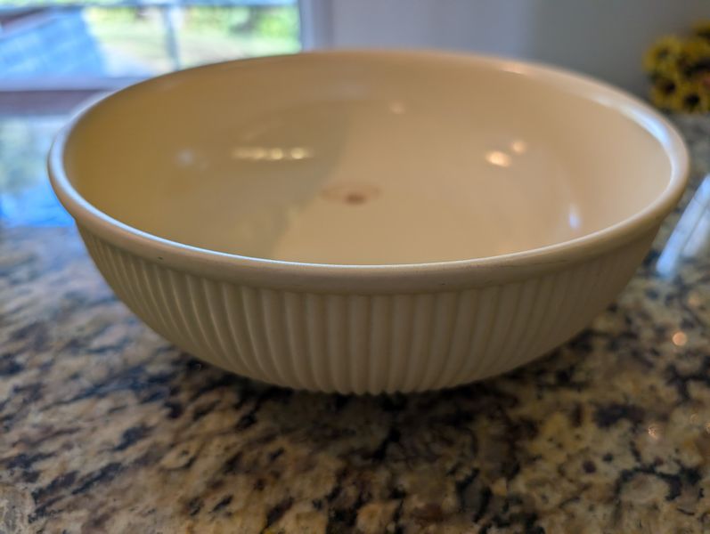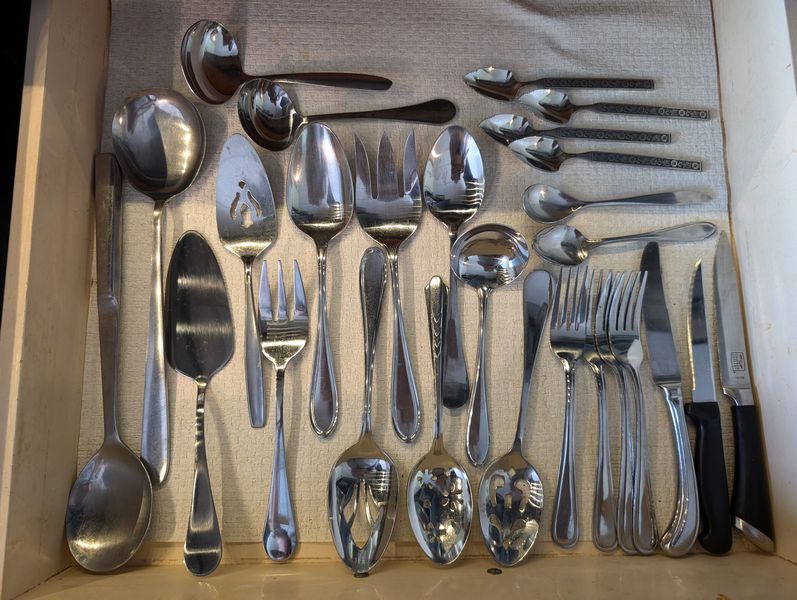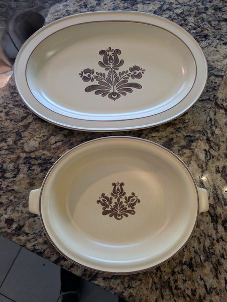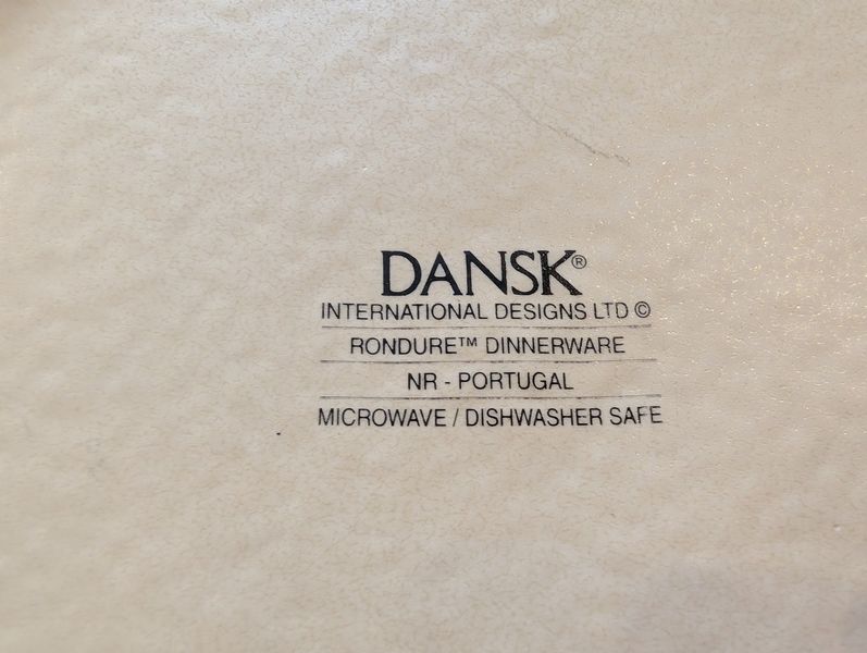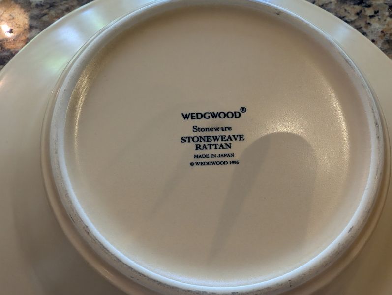 Stoneware, featuring Wedgwood, Pfaltzgraff, Dansk. Wedgwood "Rattan" bowl, 11"diameter; Pottery Barn dinner plate, 11"diameter; Pfaltzgraff oval platter, 14"L & handle oval platter, 11"L; eight Wedgwood coffee mugs; Dansk coffee mug; 10 saucers; stainless steel utensils in drawer-see photos for details.
