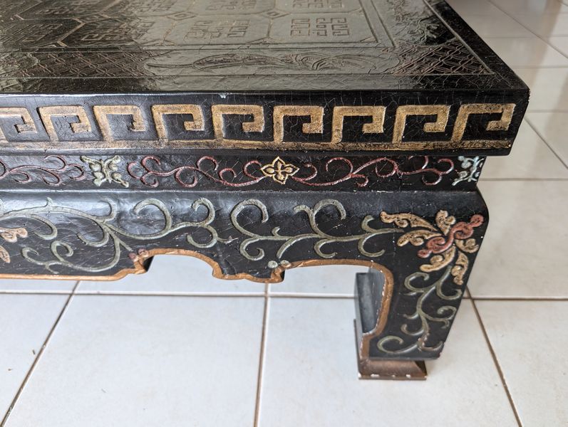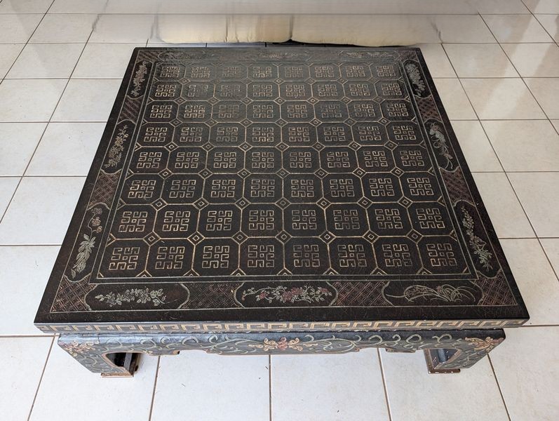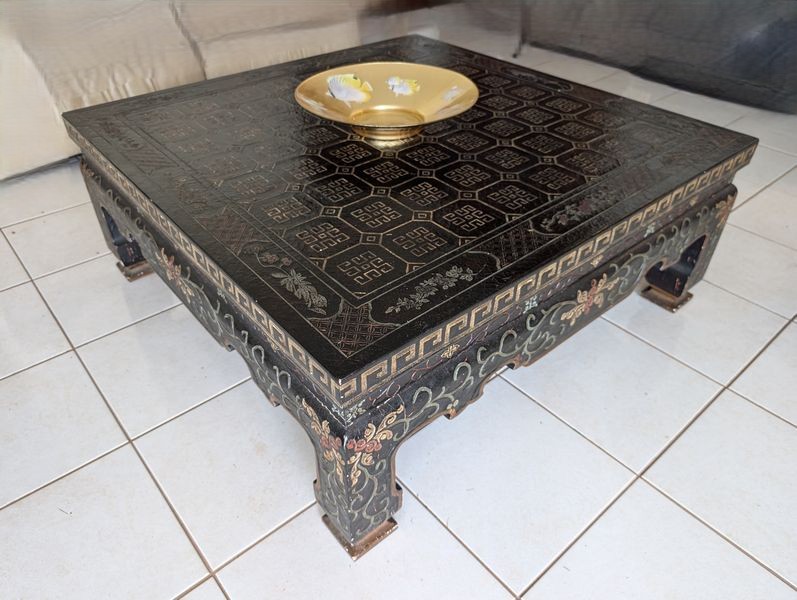 Asian-Style Coffee Table, Bowl. Heavy coffee table, 38"sq x15.5"H; decorative bowl, 13.5"diameter. See photos for details.