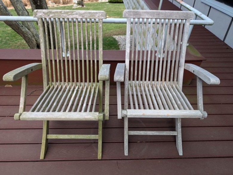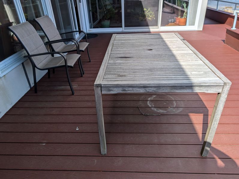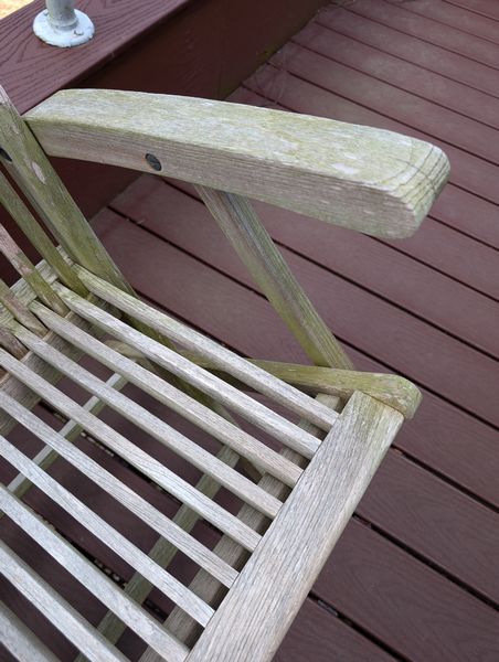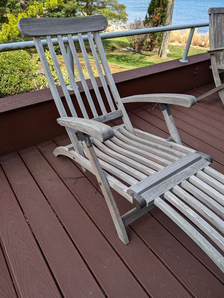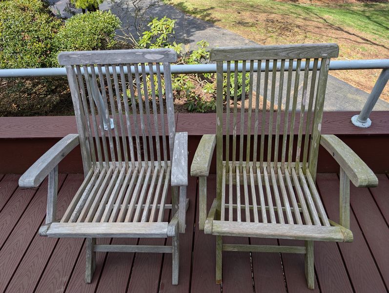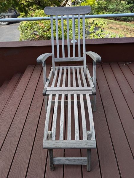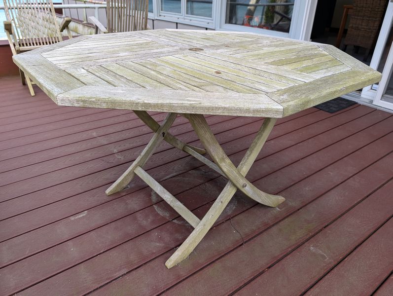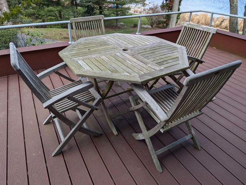 Teak Outdoor Furniture. Teak furniture incl: 5-piece Kingman set with octagon table, 47"diameter x29"H; set of 4 folding chairs, ea. 23"Wx21"Dx3'H; lounger, 2'Wx64"Lx3'H; optional rectangle table & pr chairs-see photos. Loc on back deck.
