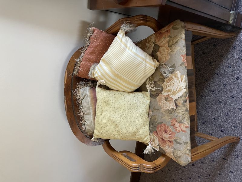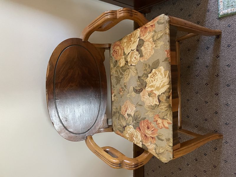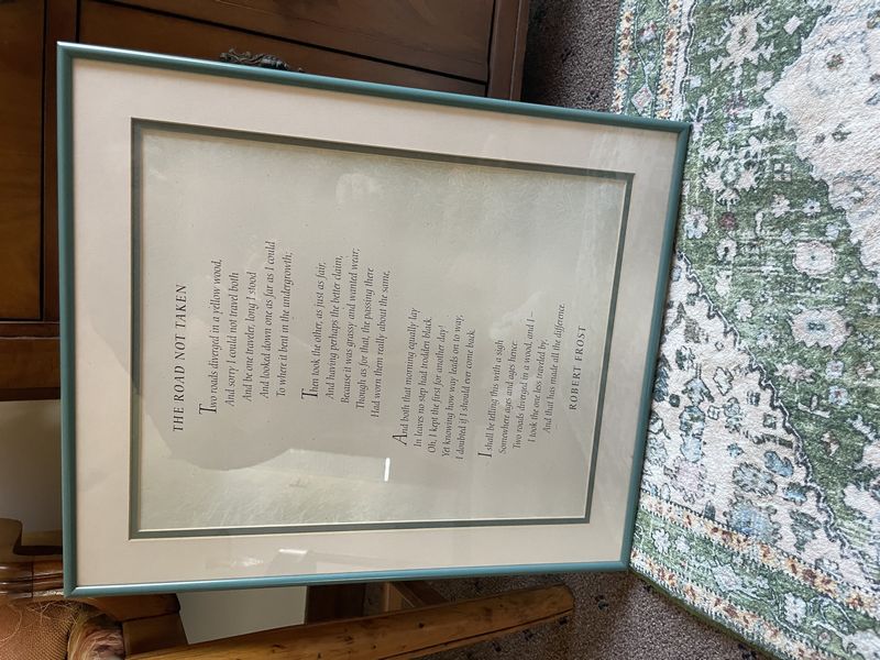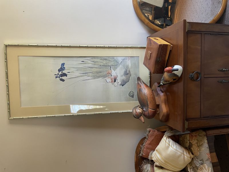 Baker Chest, Chair, Décor. Baker small chest with single drawer & cab storage; chair; oval mirror; brass lamp; framed poem by Robert Frost "The Road Not Taken"; wooden decoys & box; throw pillows and other related items as seen on photos. Located on the second floor.