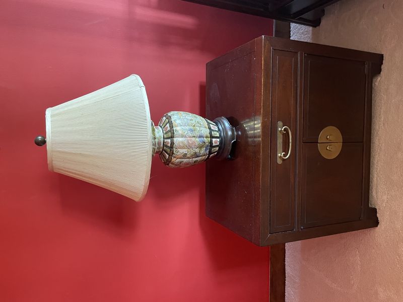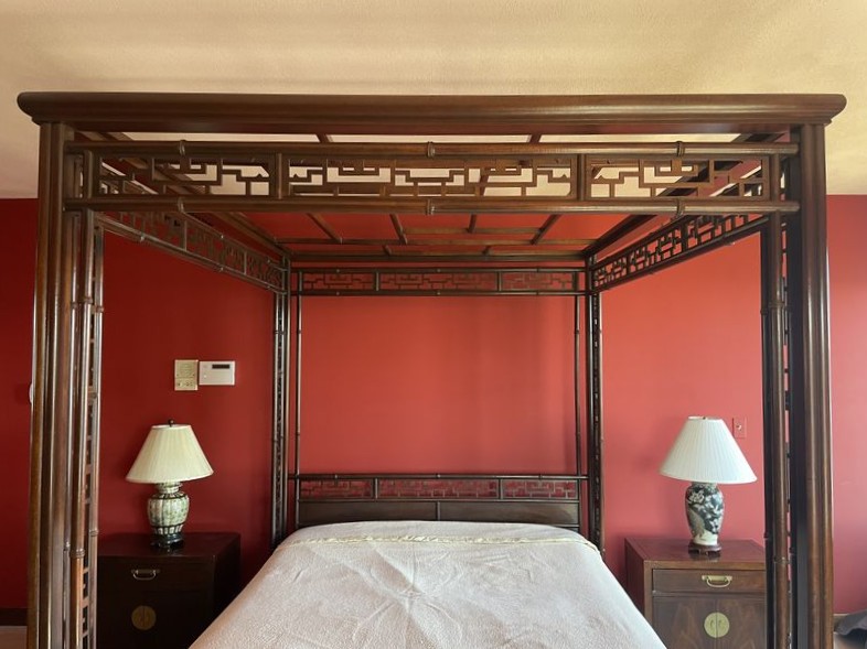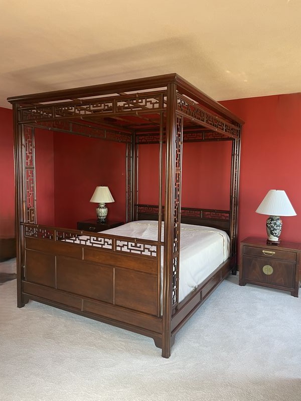 Asian-Style Wood Canopy Bed, Nightstands, Lamps. Queen bed with matching pr nightstands with single dovetailed drawers, brass HW & storage; two table lamps with shades. Matches furniture in lots #38 & #39. Located on the second floor. Bring tools to dismantle and help to safely remove.