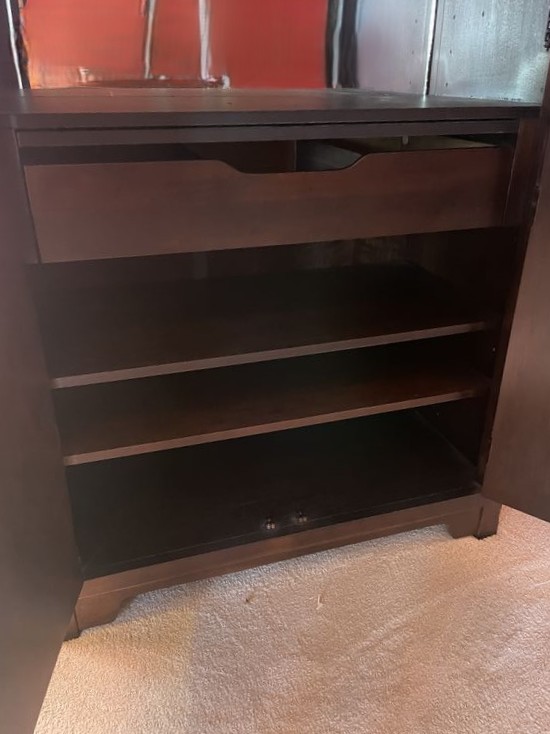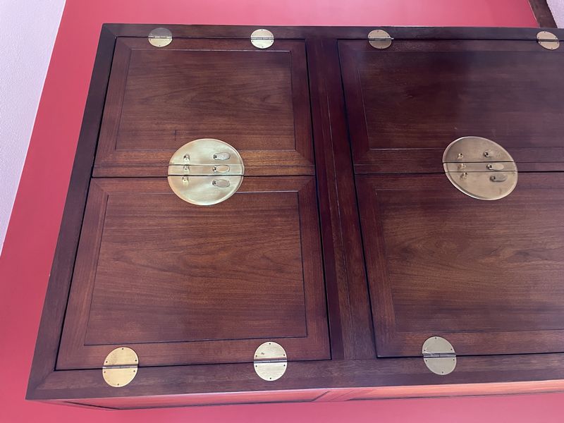 Baker Asian-Style Armoire. Baker armoire with brass HW, inside drawer & mirrored back. Matches furniture in lots #37 & #38. Located on the second floor. Bring help to safely remove.