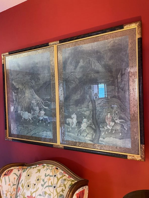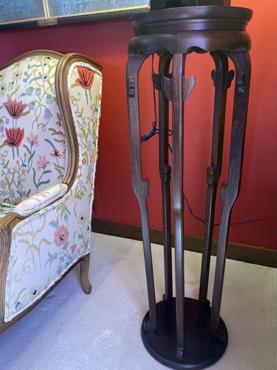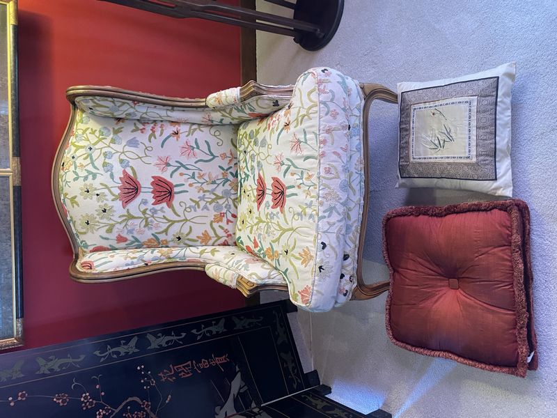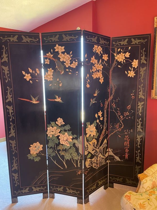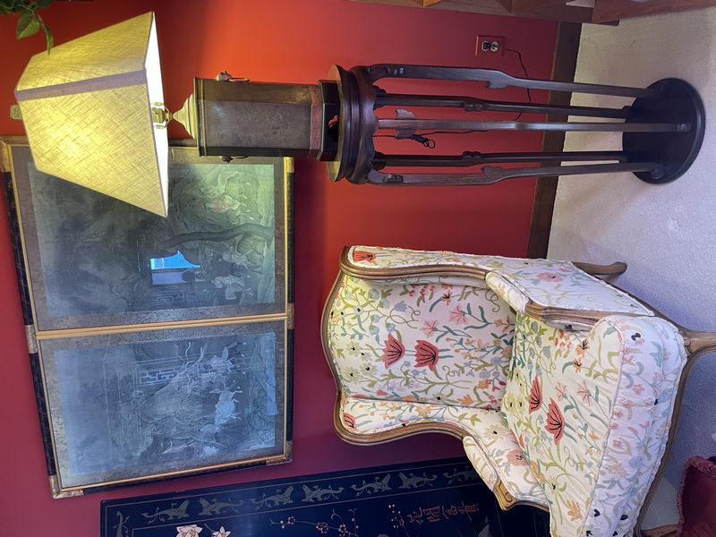 Room Screen, Chair, Lamp, Décor. Four-panel blk Asian room screen; wing-back upholstered chair with wood legs; Baker plant stand; brass/copper table lamp with shade; two prints (one faded); throw pillows. Located on the second floor.