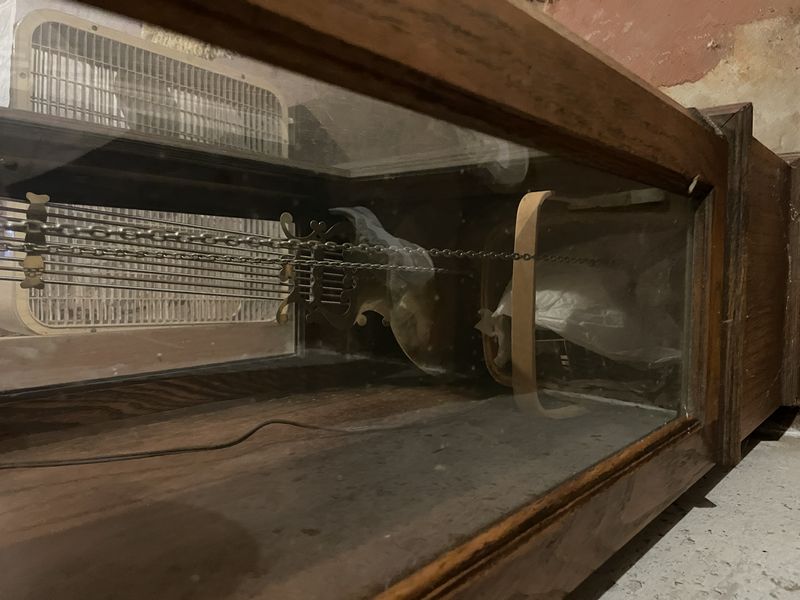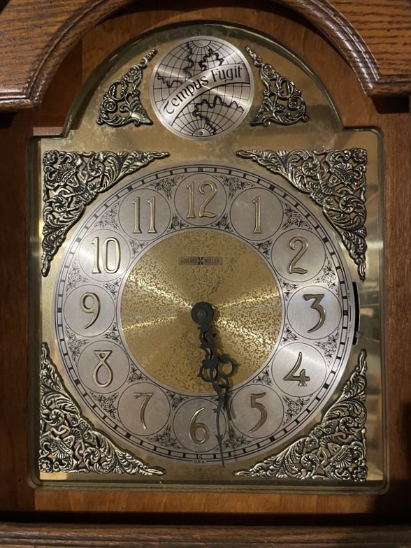 Howard Miller Grandfather Clock. Wood cabinet Howard Miller grandfather clock with brass face, pendulum & weights. See photos for details. Located in the basement..
