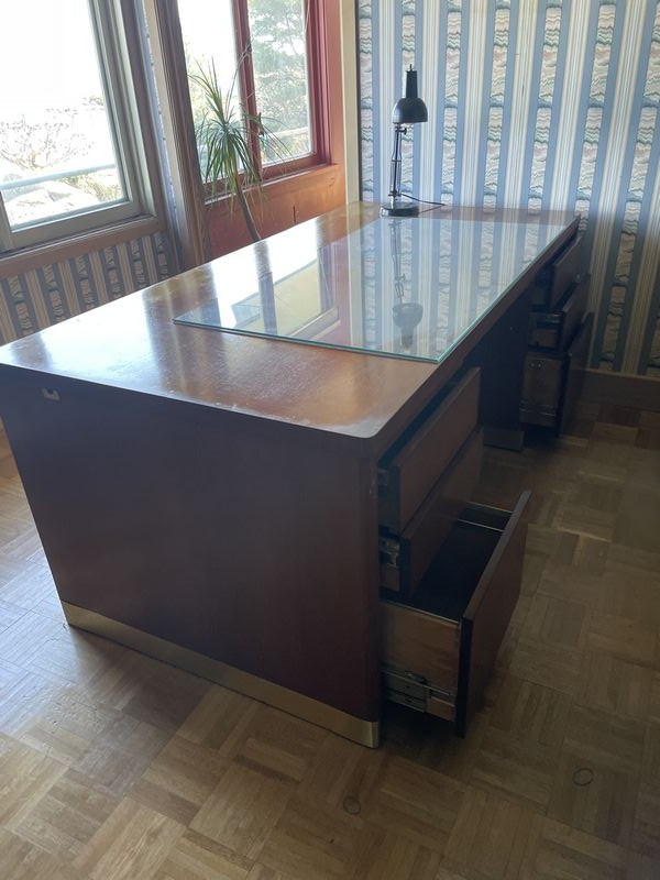 Executive Desk, Chair. Exec desk with pull-out tray on opposite side desk chair on wheels. See photos for details. Located on the main floor.