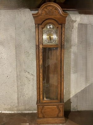 Howard Miller Grandfather Clock. Wood cabinet Howard Miller grandfather clock with brass face, pendulum & weights. See photos for details. Located in the basement..