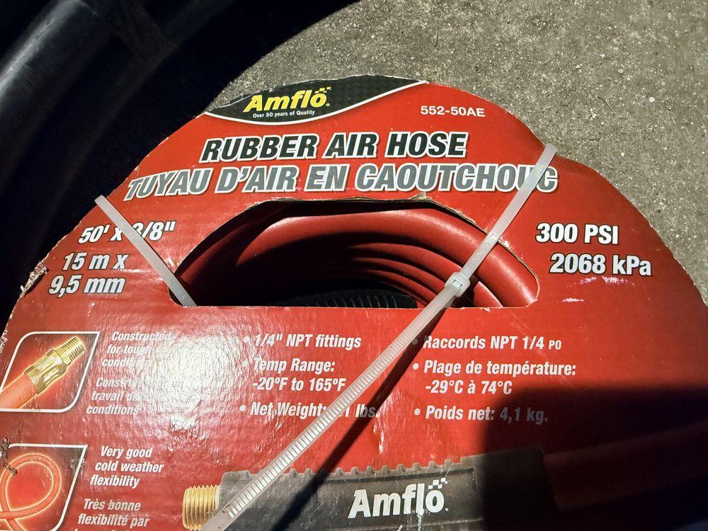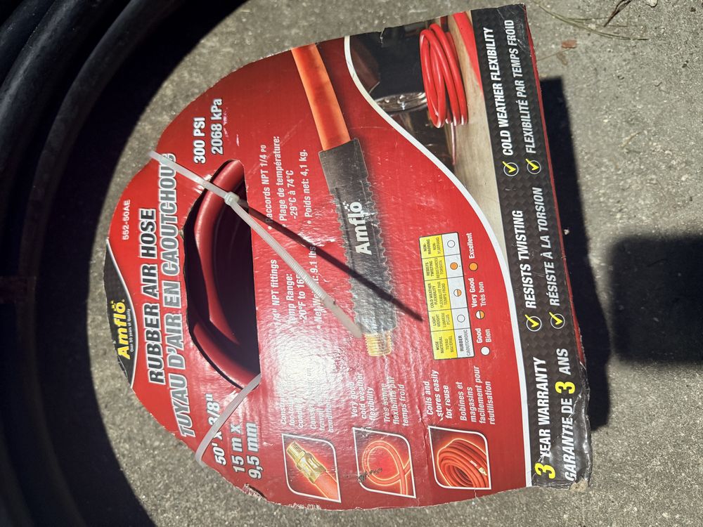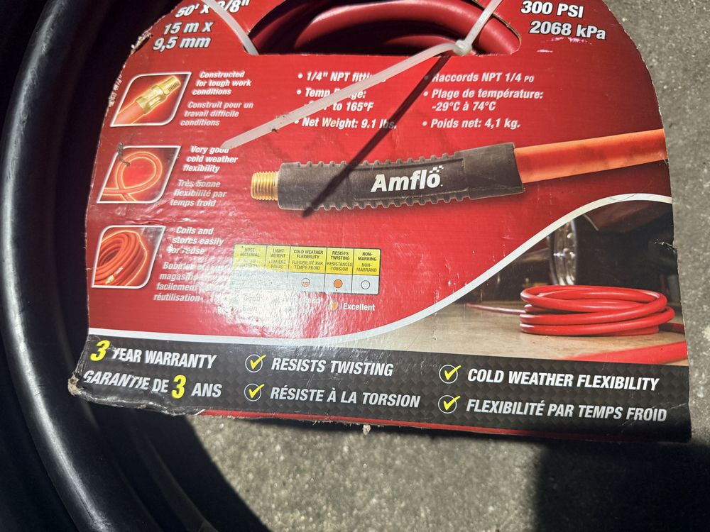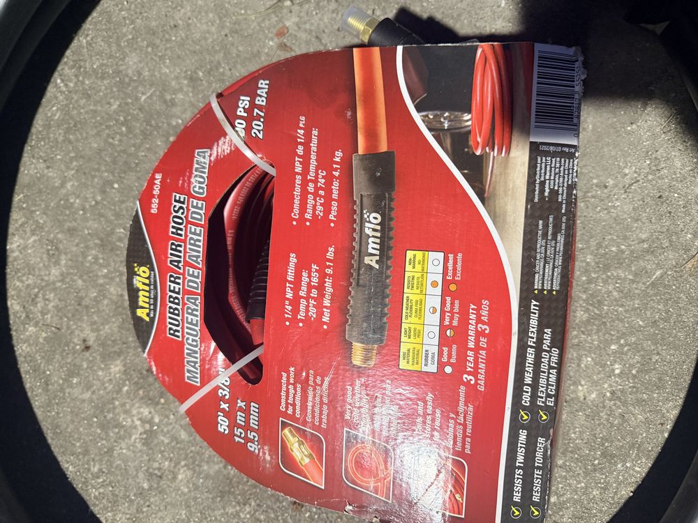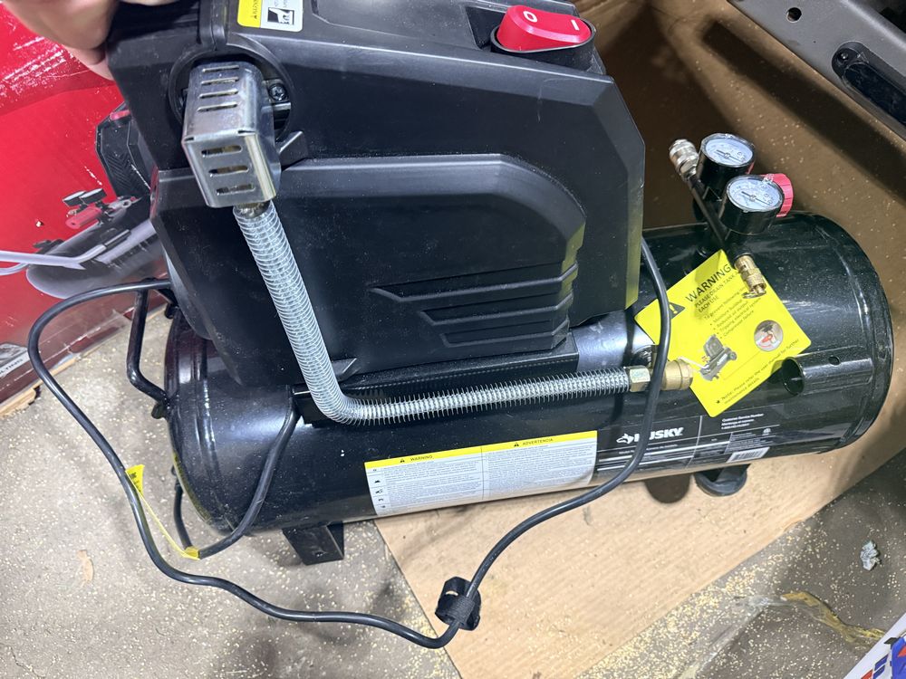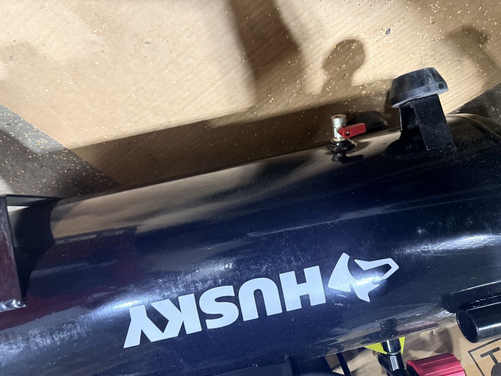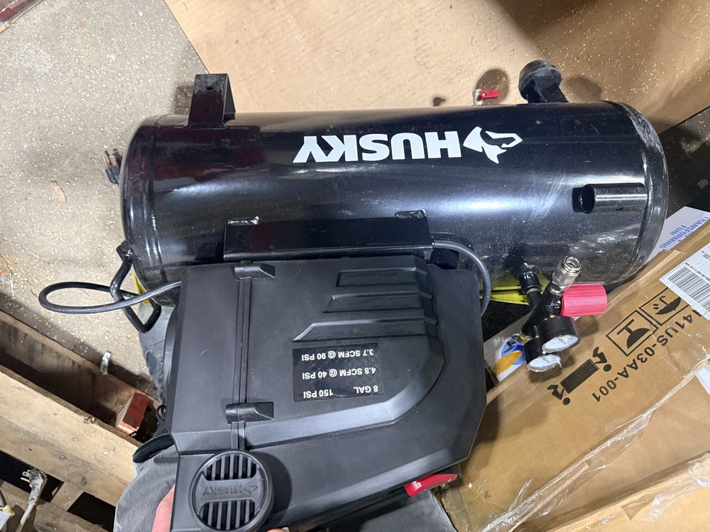 Husky 8 gallon air compressor rated 150 PSI with 1.8 HP motor and oil free pump, includes gauges and regulator; Amflo 50 foot 3/8 inch rubber air hose rated 300 PSI; coil of 1 inch black pipe. Seller reports in working condition. No assistance or equipment is available at pickup.
