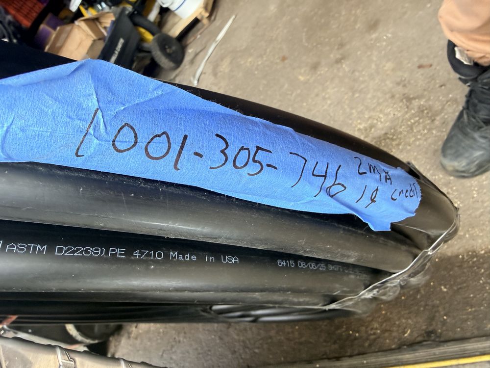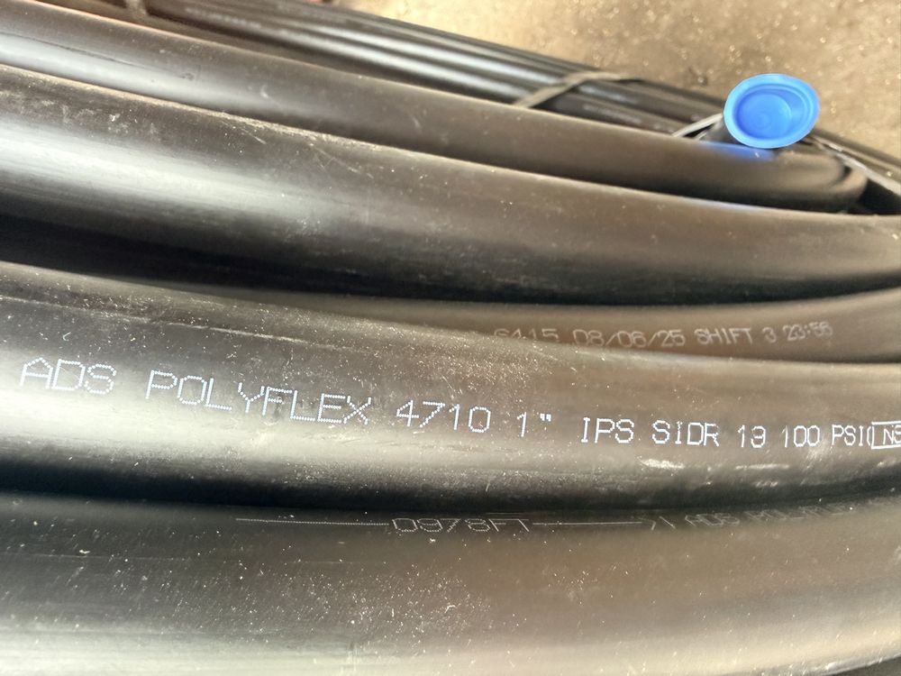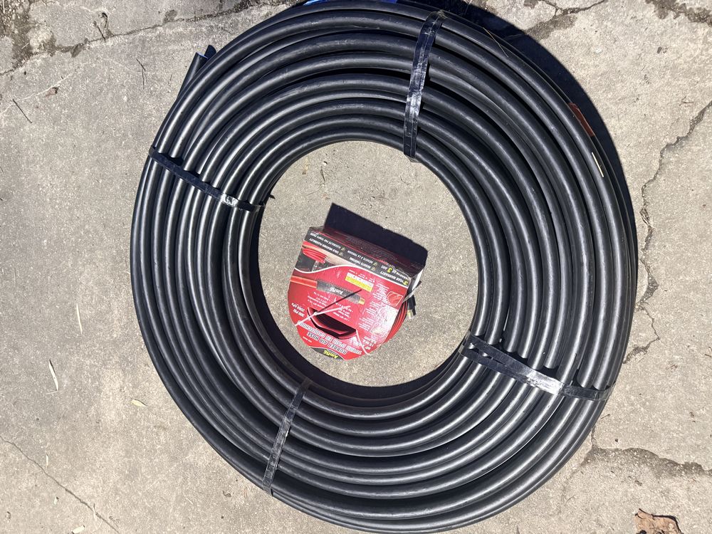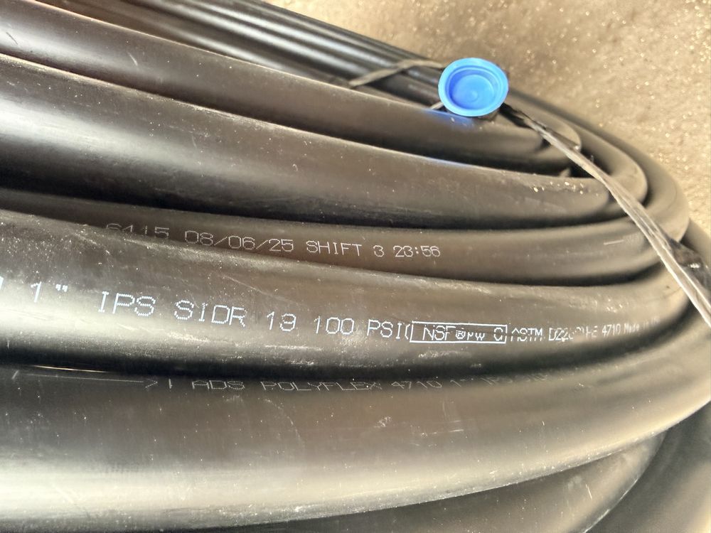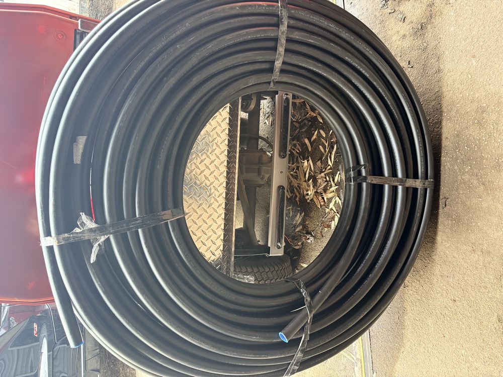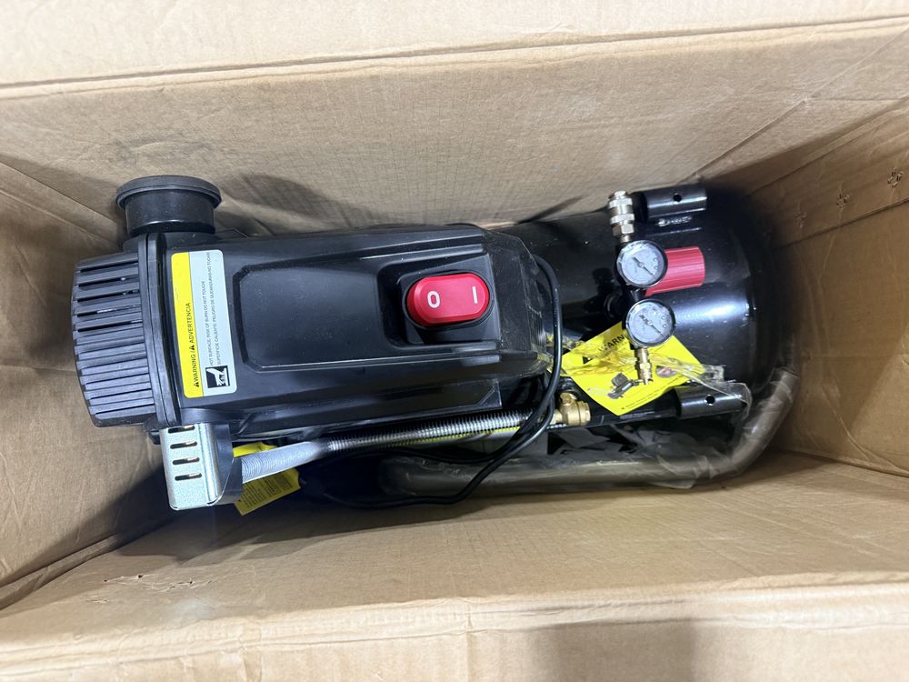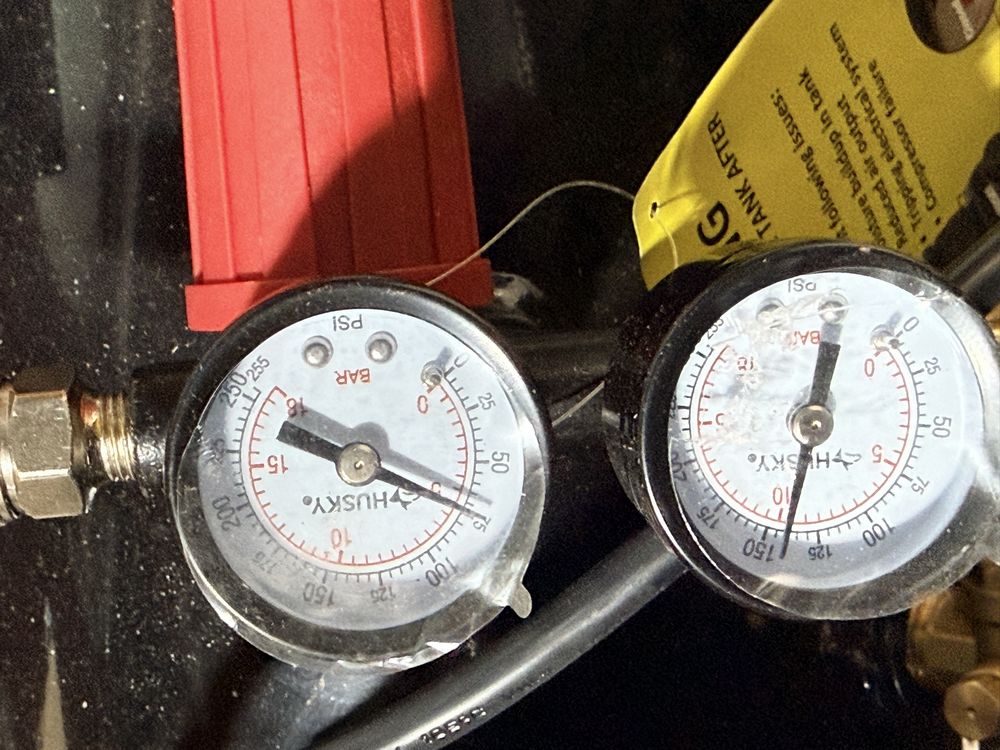 Husky 8 gallon air compressor rated 150 PSI with 1.8 HP motor and oil free pump, includes gauges and regulator; Amflo 50 foot 3/8 inch rubber air hose rated 300 PSI; coil of 1 inch black pipe. Seller reports in working condition. No assistance or equipment is available at pickup.
