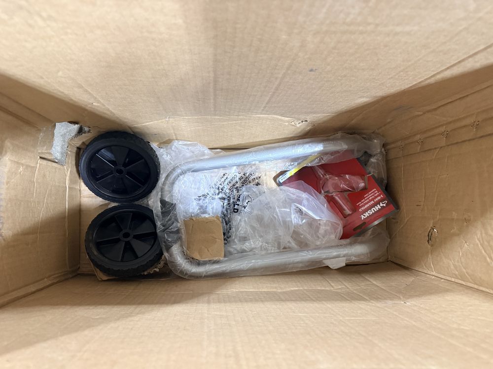Items include Husky 8 gallon air compressor; Husky 170 gallon Pro Grip storage container; pallet of assorted home improvement plumbing/lighting/hardware items & two pre-lit artificial Christmas trees. Items are located in Dover, NY.