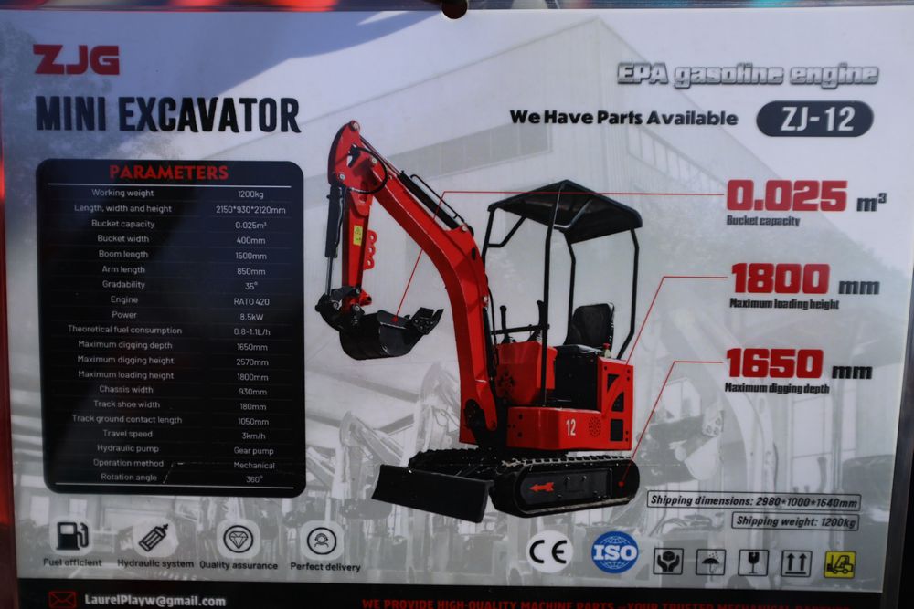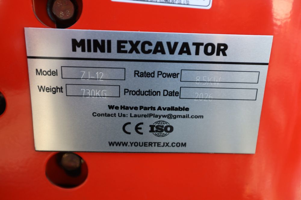 New 2026 ZJG Mini Excavator, model: ZJZ-12 with canopy, dozer blade, bucket, and gas engine. Hours reading less than 1 hour.