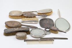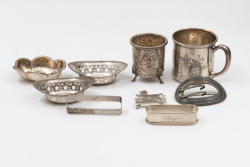 Sterling Silver Assortment with Decorative and Functional Items. Includes a variety of sterling silver pieces, such as a small mug, shell-shaped dishes, decorative circular trays, a brooch, a lidded container, and other small items. Some items display markings, engravings, or hallmarks indicating .925 sterling silver. Total weight being 322 grams.