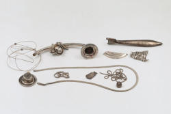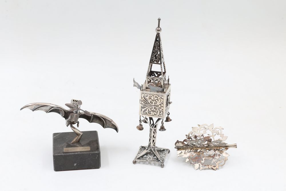 Silver Filigree Tower Spice Box, Decorative Leaf Element, and Metal Sculpture. The tower spice box features intricate filigree designs, a tall spire, small bells, and detailed cutwork patterns. The decorative leaf element is fashioned with delicate openwork in a naturalistic leaf motif. The metal sculpture depicts a bat-inspired winged figure mounted on a stone base marked "Eole - 1890" and "Majorica - 1890," numbered 62/100. Items are marked "925" and "Sterling". Sterling weight being 165 grams.