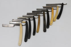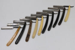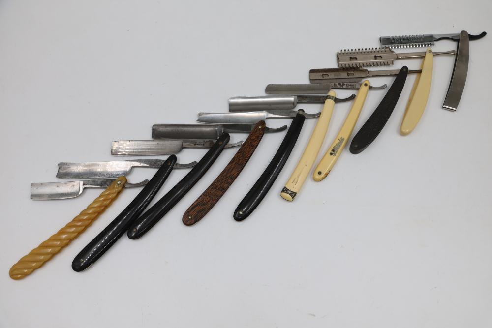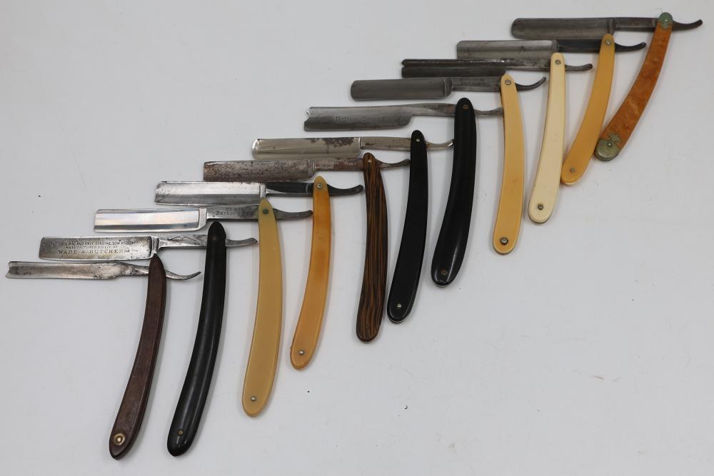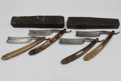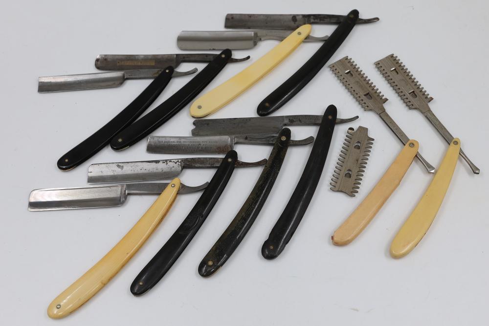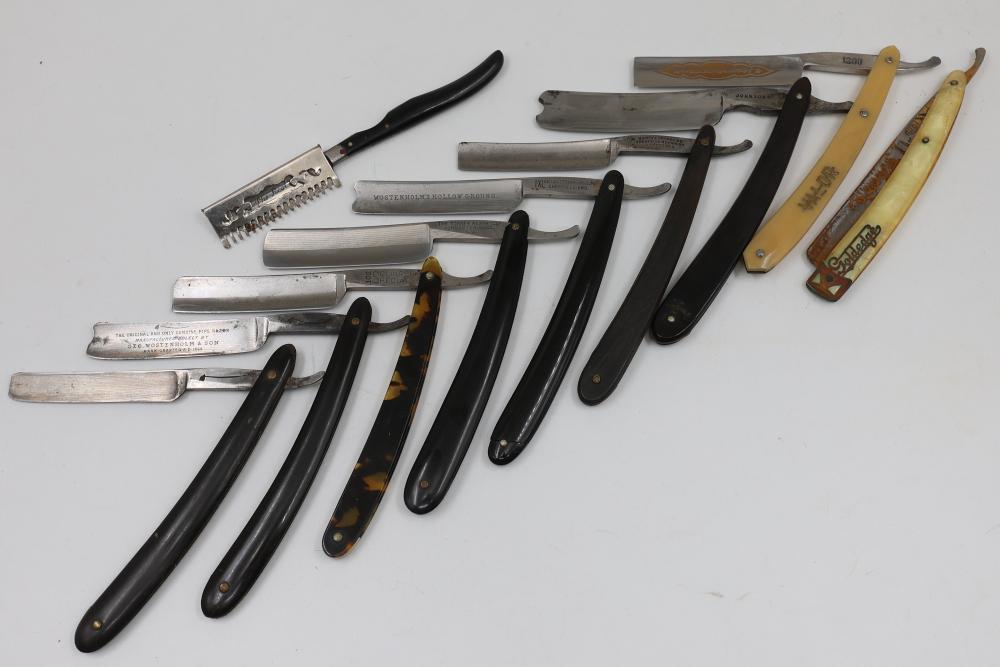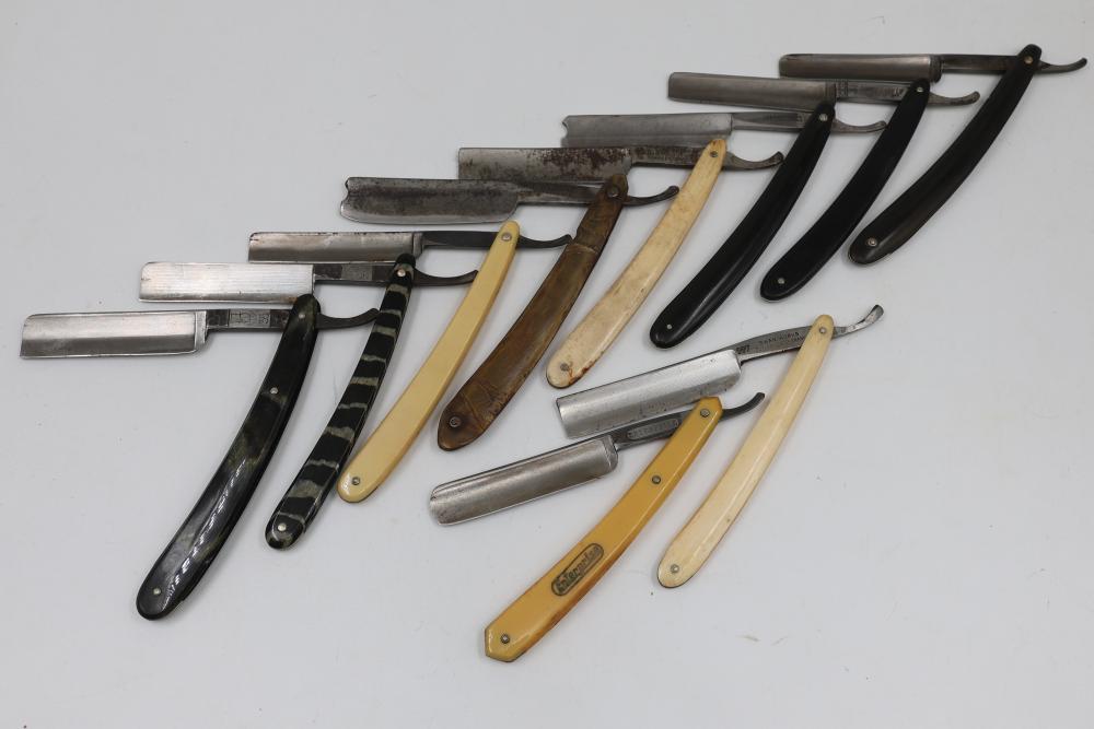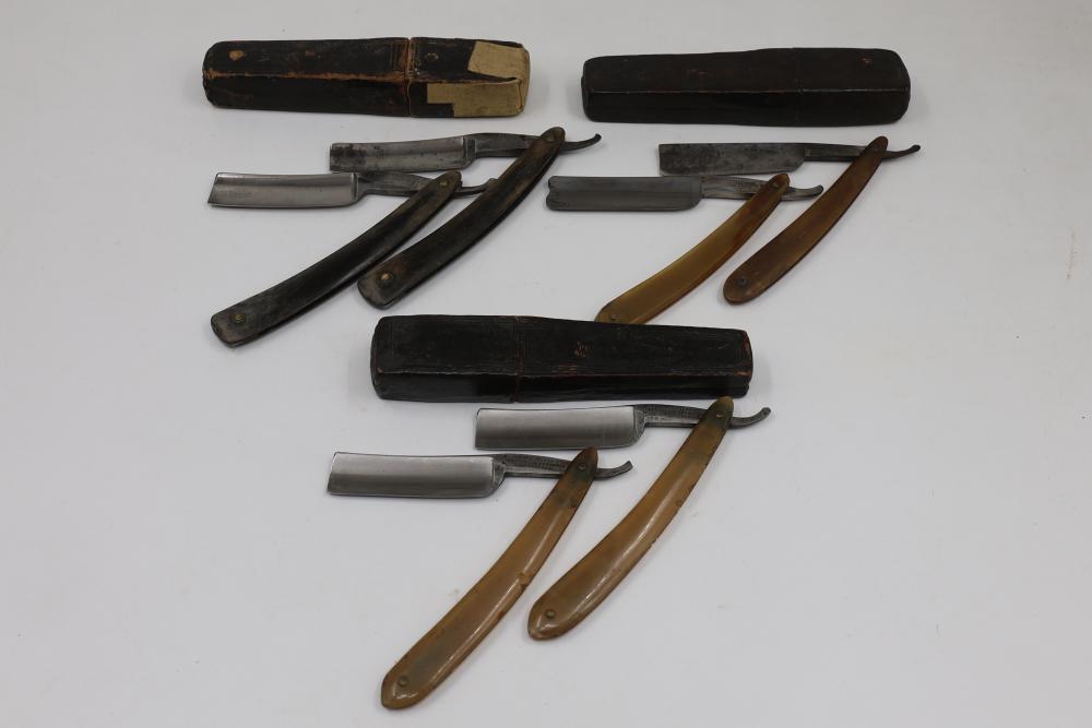 Eight Straight Razors and Two Hair Shapers, some with makers marks Sterling Silver Arrow, Tennis Solingen, J. Wiss & Sons, and George Wostenholm, featuring mixed celluloid scales, hollow-ground and full-hollow blades. Included are Weck and Durham hair shapers, additional blades, and various cases and boxes. See photos for details. Pickup only.