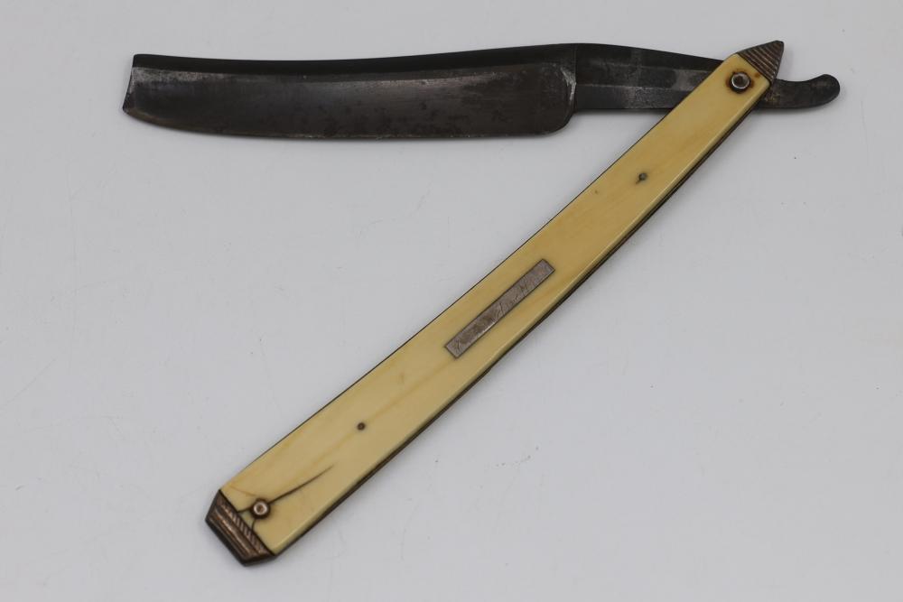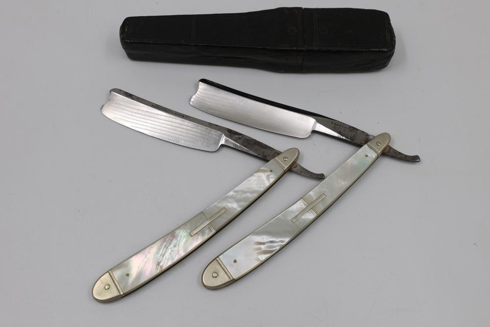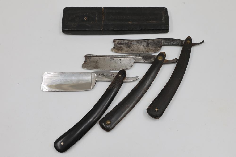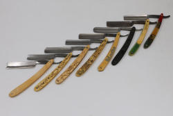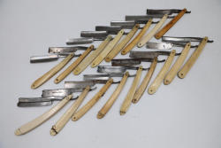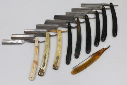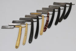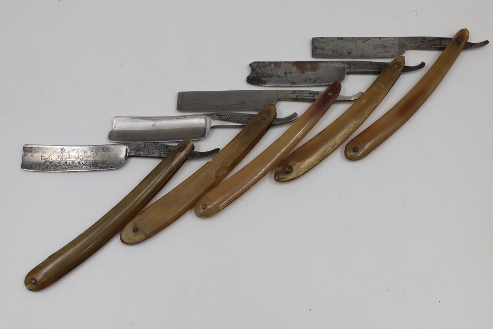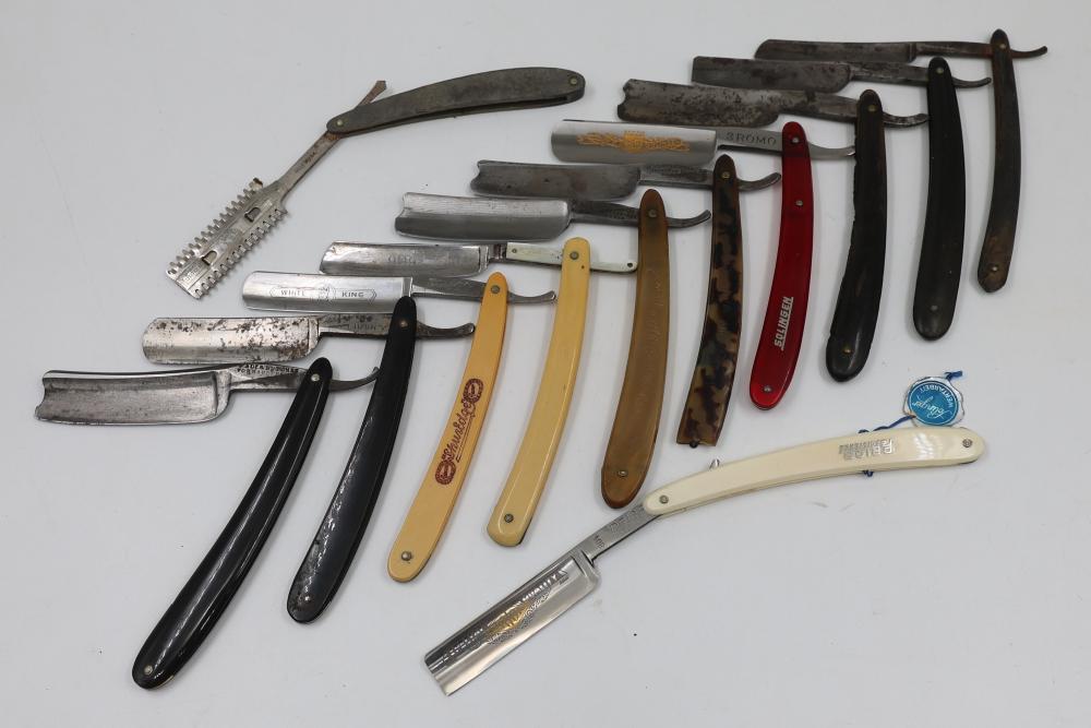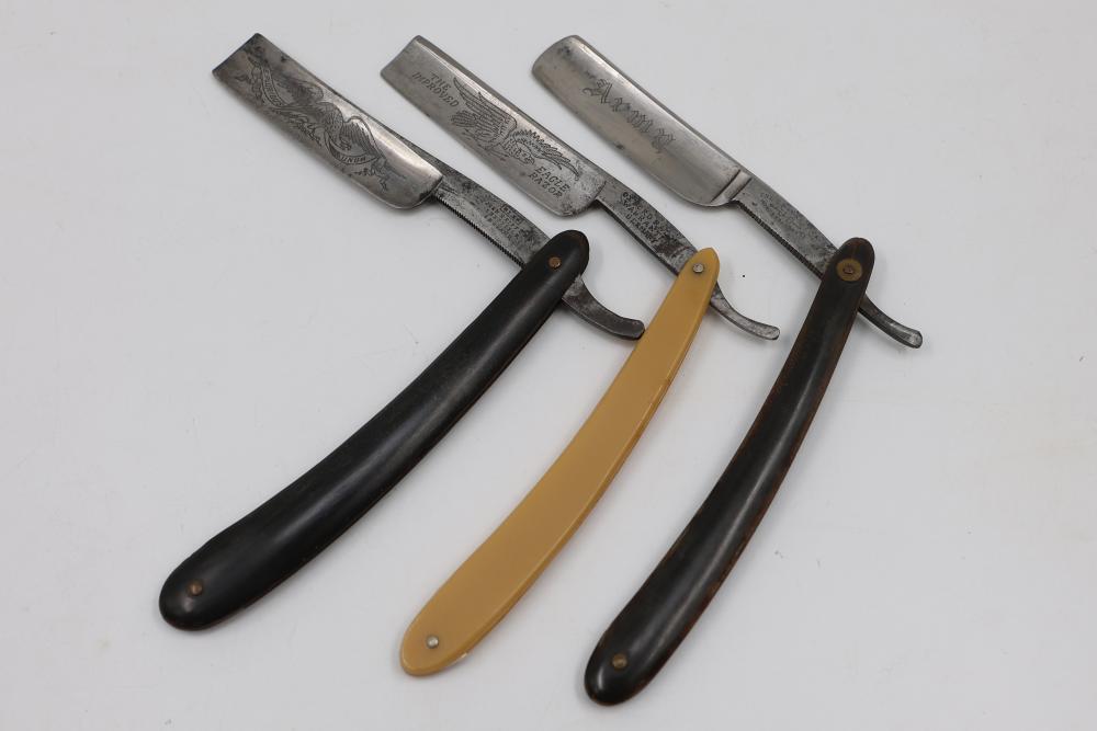 Eight Straight Razors and Two Hair Shapers, some with makers marks Sterling Silver Arrow, Tennis Solingen, J. Wiss & Sons, and George Wostenholm, featuring mixed celluloid scales, hollow-ground and full-hollow blades. Included are Weck and Durham hair shapers, additional blades, and various cases and boxes. See photos for details. Pickup only.