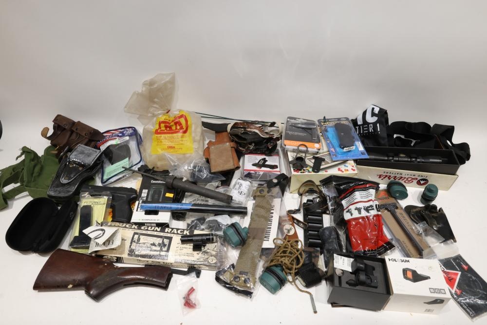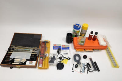 Mixed lot of firearm maintenance gear and accessories including multiple full gun-cleaning kits (Hoppes No. 9 kit with rods, brushes, jags, patches, and oil; a deluxe wooden-case multi-caliber cleaning set), three BoreSnake rifle cleaners (.270/7mm, .223/5.56, and .30 cal), two boxes of CCI 209 shotshell primers (100 each), scope caps, mounts, sling hardware, small tools, allen keys, bore light, lubricant wipes, cleaning chemicals, and assorted small parts and accessories. All lots are subject to all applicable laws at the time of transfer. NOTE: Semi automatic rifles and all handguns require a license in NYS. There is a $35 transfer fee per long gun. There is a $40 transfer fee per hand gun. There is a $20 transfer fee per ammunition lot. If you fail the background check, the transfer fee still applies, and you are still required to make payment and then reconsign the lot to auction. FFL dealers are not exempt from these fees. A background check will be required for all buyers purchasing a firearm and/or ammunition. NYS charges a background check fee for all firearms and ammunition. The fee is $9 for firearms and $2.50 for ammunition. The NYS fee is per background check NOT per lot, will be collected directly by Civil Armory, and is in addition to transfer fees. All lots are subject to all applicable laws at the time of transfer. NOTE: Semi automatic rifles and all handguns require a license in NYS. There is a $35 transfer fee per long gun. There is a $40 transfer fee per hand gun. There is a $20 transfer fee per ammunition lot. If you fail the background check, the transfer fee still applies, and you are still required to make payment and then reconsign the lot to auction. FFL dealers are not exempt from these fees. A background check will be required for all buyers purchasing a firearm and/or ammunition. NYS charges a background check fee for all firearms and ammunition. The fee is $9 for firearms and $2.50 for ammunition. The NYS fee is per background check NOT per lot, will be collected directly by Civil Armory, and is in addition to transfer fees.