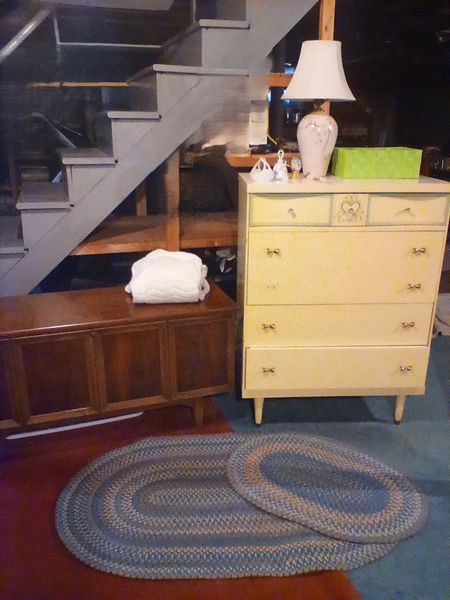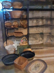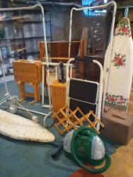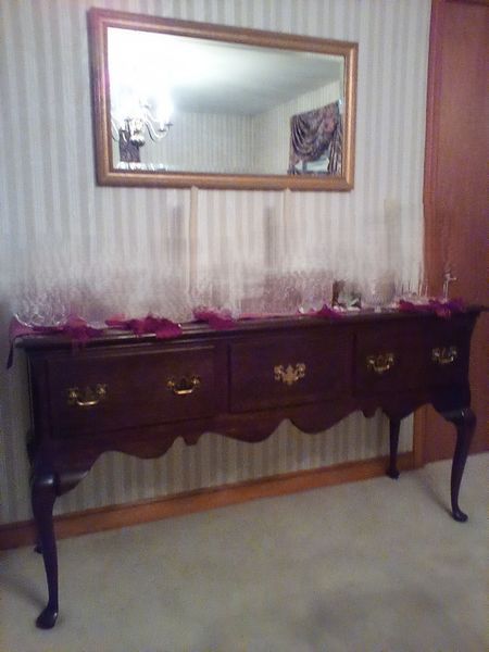 Upholstered Chair, Ottoman, Sofa Table, Décor. Marlborough Country Barn fully-upholstered skirted chair, 32"Wx33"Dx3'H with matching skirted ottoman, 27"Wx20"Dx16.5"H; queen Ann cherry finish sofa table, 52"Wx16.5"Dx27.5"H with two dovetailed drawers; porcelain table lamp, 18"H; assort decor incl swans; pr oil lamps; Hancock Shaker oval wood handle basket; five pcs wall art; throw pillow. See photos for details.